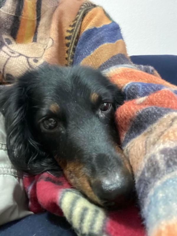 P'Nut joined his current family after his mom died and Debbie lost Bailee. Debbie gave P'Nut a forever home with her other Doxy, Bear, who was also grieving for Bailee. P'Nut was a bit anxious at first but feels more safe and secure as time goes by. He now knows he is in his forever home.