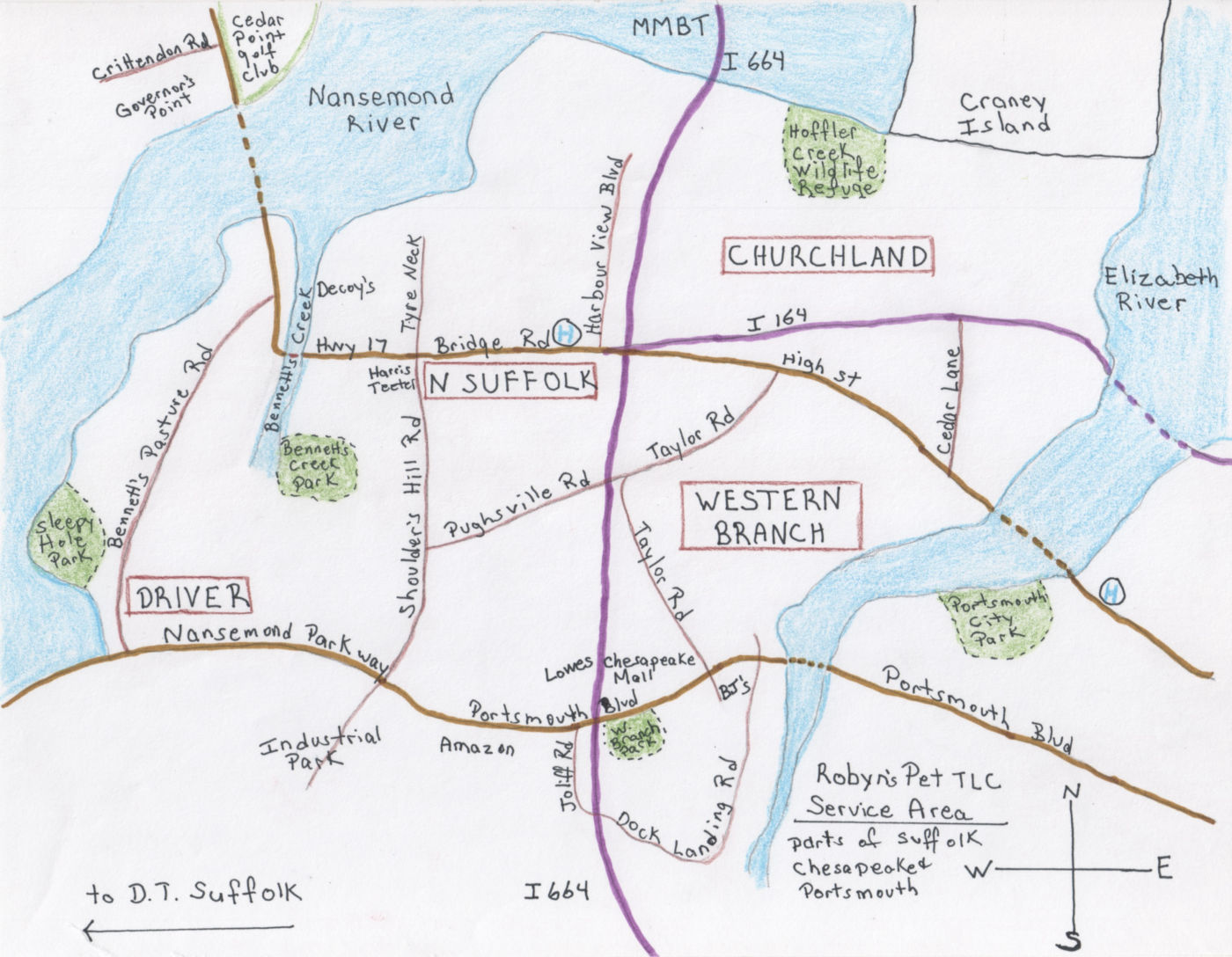 I limit my area to approximately 10 miles around my home in North Suffolk so I can get to your cats and dogs quickly. I sit for pets in North Suffolk, Harborview, Churchland, Western Branch, Dock Landing, Chesapeake Square, Cedar Point and Driver.